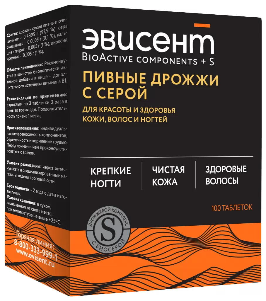 Пивные дрожжи с серой «Эвисент» незаменимы для молодости, красоты и здоровья кожи, волос и ногтей. Превосходный натуральный комплекс, который восполняет дефицит важнейших витаминов и макроэлементов в организме. Повышенное содержание серы в составе способствует оздоровлению и улучшению состояния проблемной кожи. Пивные дрожжи с серой «Эвисент» замедляют процесс старения, повышают эластичность и упругость кожи, активизируют рост волос и ногтей. Не увеличивают массу тела.
