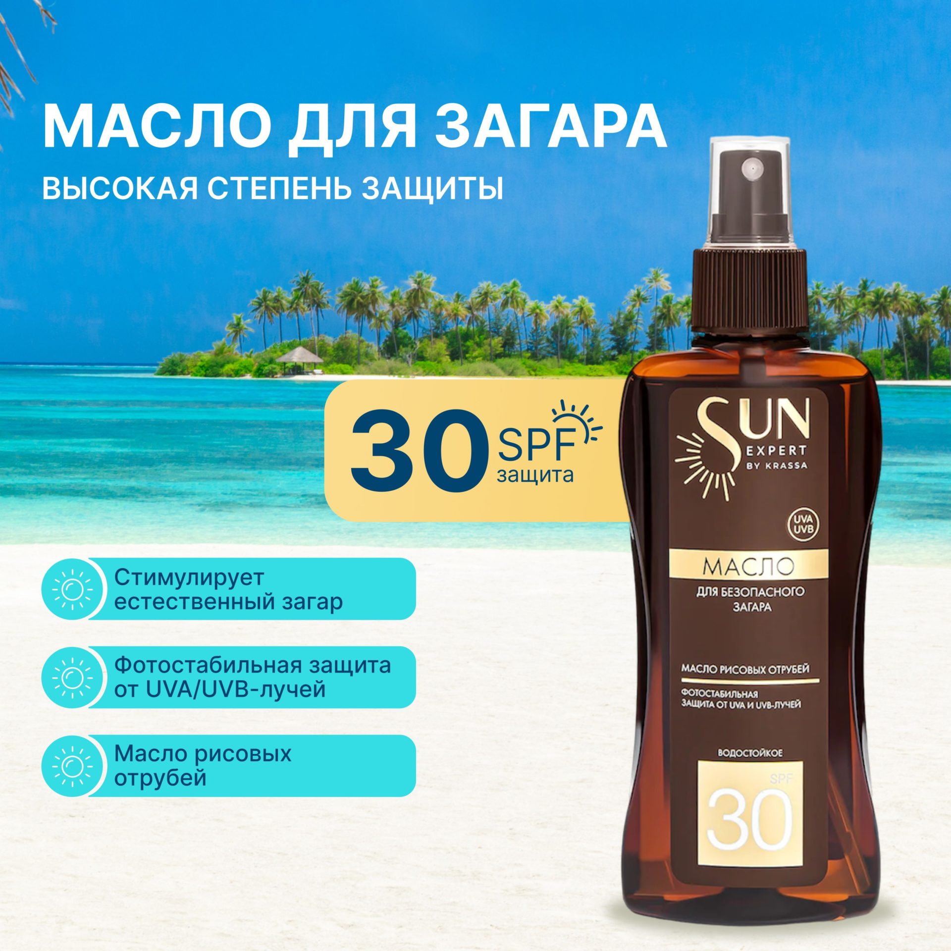 Описание: Интенсивный загар с высокой защитой. Фотостабильный комплекс UVA/UVB-фильтров для эффективной защиты кожи от вредного воздействия УФ-лучей. Масло рисовых отрубей богато витаминами Е, А, РР и В и жирными кислотами, обладает регенерирующим свойством, интенсивно увлажняет и питает кожу, защищая её от обезвоживания, вызванного пребыванием на солнце, ускоряет проявление равномерного и глубокого загара. Применение: равномерно распределить по коже перед выходом на солнце. Повторять нанесение каждые 1,5–2 часа и/или после купания, вытирания полотенцем. Возможна индивидуальная непереносимость ингредиентов состава. Не наносить на область вокруг глаз. В случае попадания в глаза немедленно промыть водой. Избегать контакта с одеждой до полного впитывания. Состав: Mineral Oil (Paraffinum Liquidum), Homosalate, Octocrylene, Bisethylhexyloxyphenol, Methoxyphenyl Triazine, Butyl Methoxydibenzoylmethane, Ethylhexyl Salicylate, Prunus Amygdalus Dulcis (Sweet Almond) Oil, Ethylhexyl Methoxycinnamate, Butyl Methoxydibenzoylmethane, Benzophenone-3, Oryza Sativa (Rice) Germ Oil, Tocopheryl Acetate, BHT, Parfum.