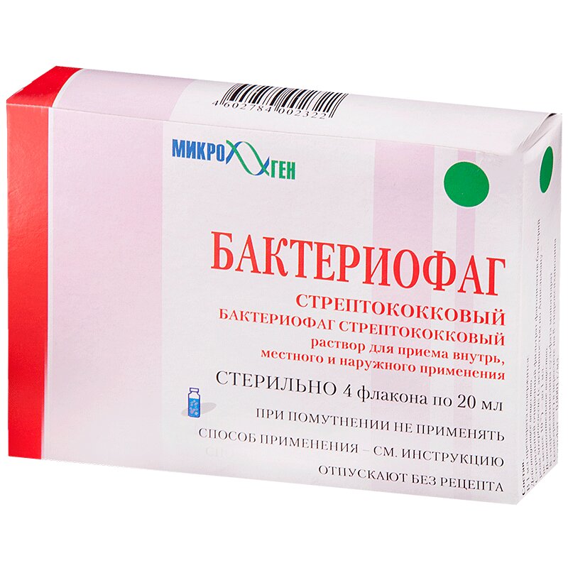 Действующее вещество: бактериофаг стрептококковый (стерильный фильтрат фаголизатов штаммов Streptococcus) 20 мл
