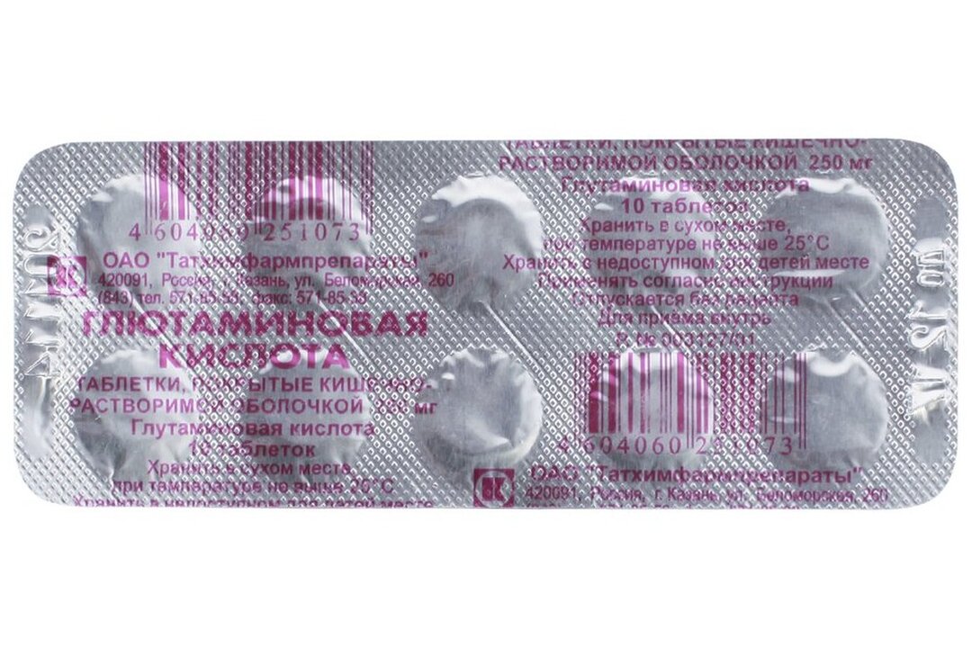 Действующее вещество: глутаминовая кислота — 250 мг.